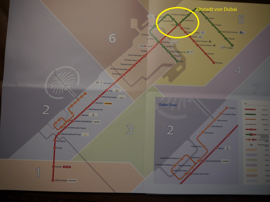 J´etais attendu avec beaucoup d´impatience sur tous qui a se changé à Dubai depuis j´y etais la dernière fois il y a 11 ans. Donc j´ai commencé avec une petite voyage de reconnaissance dans la cité. Je ne croiais pas qu´il y a des chooses changées, mais j´avais envie de revoir les Souqs. Le Gold Souq, Spice Souq et tous autre choose typique arabe. Rien a se changé. Sauf les moyens d´y aller. En effet, à l´époque il n´y avait pas le Metro. Je me rapelle que j´ai vu pas mal des chantiers, sans savoir que ca deviens la nouvelle Metro de Dubai. Donc je suis parti de la station Al Rigga prét de mon Hôtel jusqu´a la station Palm Deira. Il n´y a que deux lignes - ligne rouge et ligne verte. Sur le plan c´est la station la plus proche au Souqs.